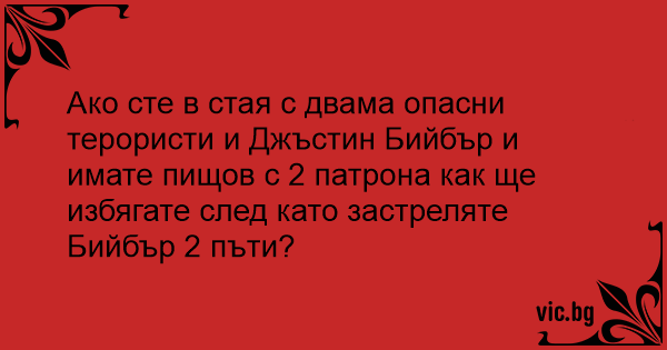 Ако сте в стая с двама опасни терористи и Джъстин Бийбър и имате пищов с 2 патрона как ще избягате след като застреляте Бийбър 2 пъти?