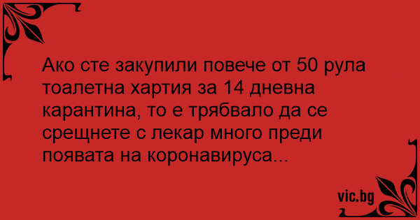 Ако сте закупили повече от 50 рула тоалетна хартия за 14 дневна карантина, то е трябвало да се срещнете с лекар много преди появата на коронавируса...