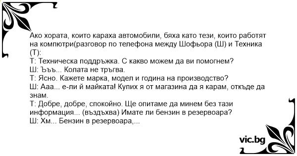 Ако хората, които караха автомобили, бяха като тези, които работят на компютри(разговор по телефона между Шофьора (Ш) и Техника(T):