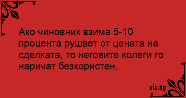 Ако чиновник взима 5-10 процента рушвет от цената на сделката, то неговите колеги го наричат безкористен.