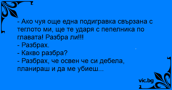 - Ако чуя още една подигравка свързана с теглото ми, ще те ударя с пепелника по главата! Разбра ли!!!
