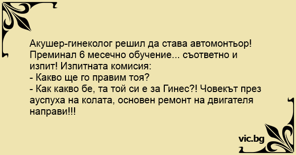 Мъж отишъл в автосервиз за проблеми с двигателя. Заговорил се с монтьора и споменал, че е кардиохирург. В този момнет монтьорът казал: