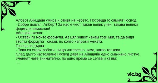 След дълго настояване Господ дава на Айнщайн едно смачкано листче. Ученият чете внимателно, по едно време се сепва и казва: