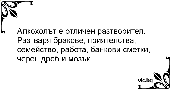 Алкохолът е отличен разтворител. Разтваря бракове, приятелства, семейство, работа, банкови сметки, черен дроб и мозък.