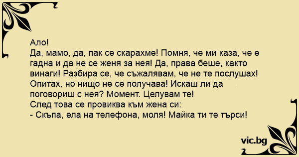 - Скъпа, ела на телефона, моля! Майка ти те търси!