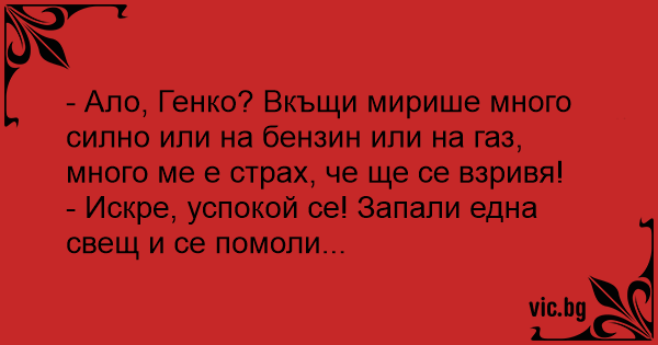 - Ало, Генко? Вкъщи мирише много силно или на бензин или на газ, много ме е страх, че ще се взривя!