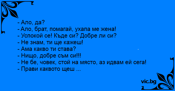 - Aло, брат, помагай, ухапа ме жена!