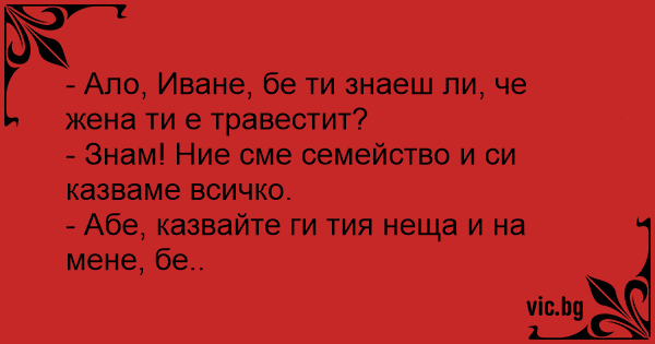 - А бе, ти знаеш ли, че жена ти е травестит?