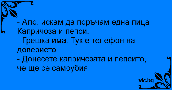 - Ало, искам да поръчам една пица Капричоза и пепси.