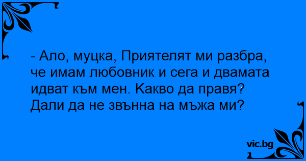 - Ало, муцка, Приятелят ми разбра, че имам любовник и сега и двамата идват към мен. Kакво да правя? Дали да не звънна на мъжа ми?