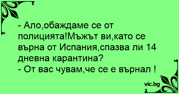 - Ало,обаждаме се от полицията!Мъжът ви,като се върна от Испания,спазва ли 14 дневна карантина?