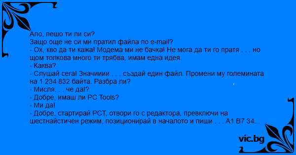 - Слушай сега! Значииии . . . създай един файл. Промени му големината на 1 234 832 байта. Разбра ли?