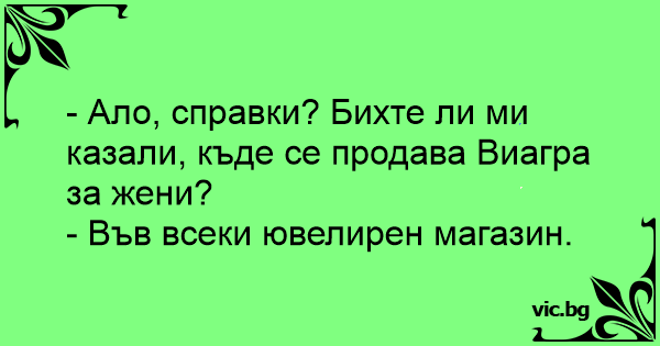- Alo, biroul de informatii? Spuneti-mi, va rog, unde pot gasi Viagra pentru femei? - In orice magazin de bijuterii.