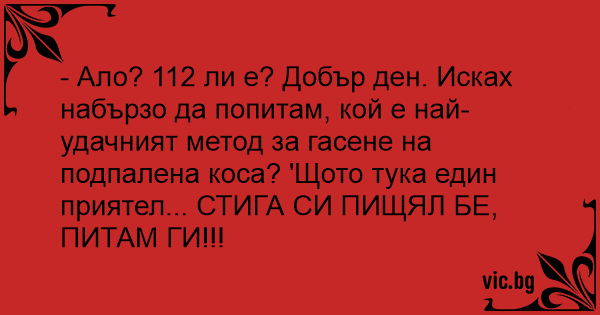 - Ало? 112 ли е? Добър ден. Исках набързо да попитам, кой е най-удачният метод за гасене на подпалена коса? 'Щото тука един приятел... СТИГА СИ ПИЩЯЛ БЕ, ПИТАМ ГИ!!!