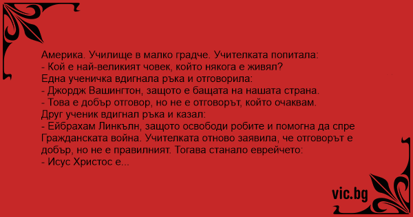 - Ейбрахам Линкълн, защото освободи робите и помогна да спре Гражданската война. Учителката отново заявила, че отговорът е добър, но не е правилният. Тогава станало еврейчето: