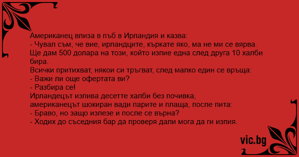 - Чувал съм, че вие, ирландците, къркате яко, ма не ми се вярва.