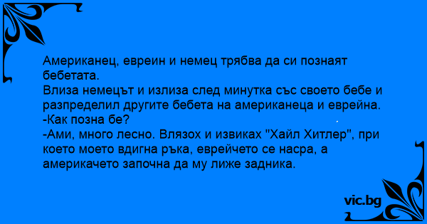 Влиза немецът и излиза след минутка със своето бебе и разпределил другите бебета на американеца и еврейна.