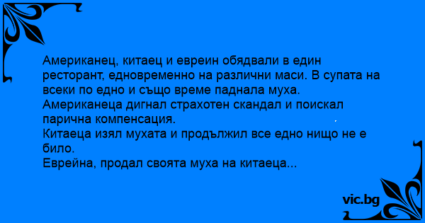 Американец, китаец и евреин обядвали в един ресторант, едновременно на различни маси. В супата на всеки по едно и също време паднала муха.