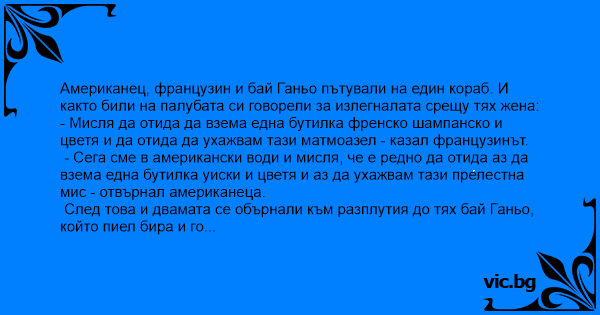 Американец, французин и бай Ганьо пътували на един кораб. И както били на палубата си говорели за излегналата срещу тях жена: