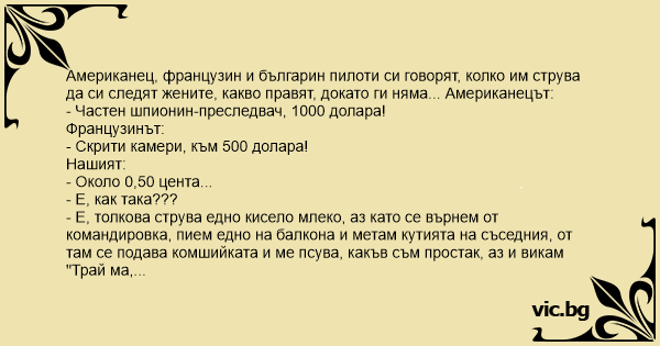 Американец, французин и българин пилоти си говорят, колко им струва да си следят жените, какво правят, докато ги няма... Американецът: