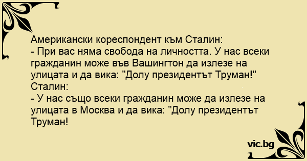 - При вас няма свобода на личността. У нас всеки гражданин може във Вашингтон да излезе на улицата и да вика: "Долу президентът Труман!"