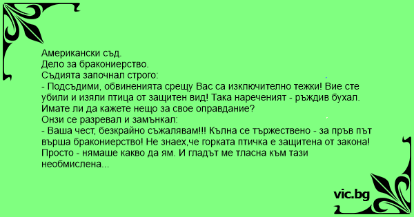 - Ваша чест, безкрайно съжалявам!!! Кълна се тържествено - за пръв път върша бракониерство! Не знаех,че горката птичка е защитена от закона! Просто - нямаше какво да ям. И гладът ме тласна към тази необмислена постъпка!
