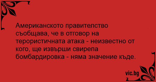 Американското правителство съобщава, че в отговор на терористичната атака - неизвестно от кого, ще извърши свирепа бомбардировка - няма значение къде.