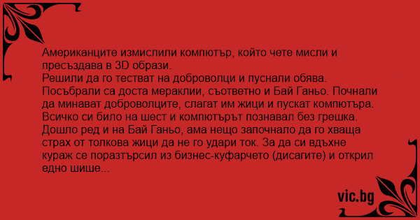 Решили да го тестват на доброволци и пуснали обява. Посъбрали са доста мераклии, съответно и Бай Ганьо. Почнали да минават доброволците, слагат им жици и пускат компютъра. Всичко си било на шест и компютърът познавал без грешка. Дошло ред и на Бай Ганьо, ама нещо започнало да го хваща страх от толкова жици да не го удари ток. За да си вдъхне кураж се поразтърсил из бизнес-куфарчето (дисагите) и открил едно шише двойно препечена ракия. Започнал да понадига шишето и докато му дошъл реда вече бил изпил цялото шише. Седнал на стола, сложили му жиците, пуснали компютъра и гледат образа - само строителни материали - вар, пясък, тухли. Питали го за какво си мисли, ама той вече бил неадекватен. Решили, че компютърът вече е прегрял и спрели експеримента. На другия ден питат Бай Ганьо за какво си е мислил, ама той нямал никакви спомени. Обяснили му хората, че на образа имало само строителни материали - вар, пясък, тухли, а нашия се плеснал по главата и казал:
