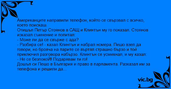 - Разбира се! - казал Клинтън и набрал номера. Пешо взел да говори, но брояча на парите се въртял страшно бързо и той приключил разговора набързо. Клинтън се усмихнал, и му казал: