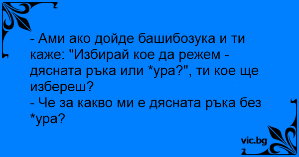 - Ами ако дойде башибозука и ти каже: "Избирай кое да режем - дясната ръка или kуpa?", ти кое ще избереш?