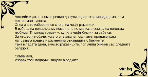 Mлад мъж искал да купи подарък за рождения ден на новата си приятелката, но тъй като излизали съвсем отскоро, дълго се колебал и решил, че чифт ръкавици носят най-подходящото послание: