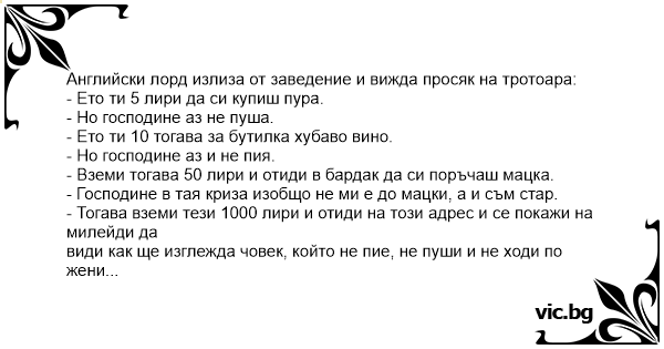 Английски лорд излиза от заведение и вижда просяк на тротоара:
