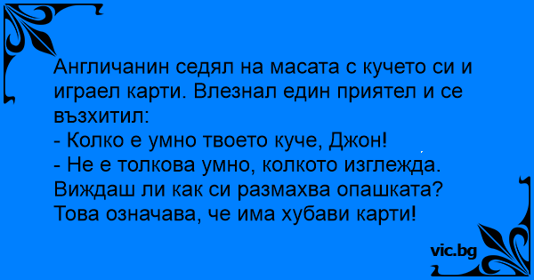 Англичанин седял на масата с кучето си и играел карти. Влезнал един приятел и се възхитил: