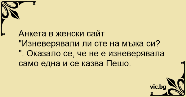Анкета в женски сайт "Изневерявали ли сте на мъжа си? ". Оказало се, че не е изневерявала само една и се казва Пешо.
