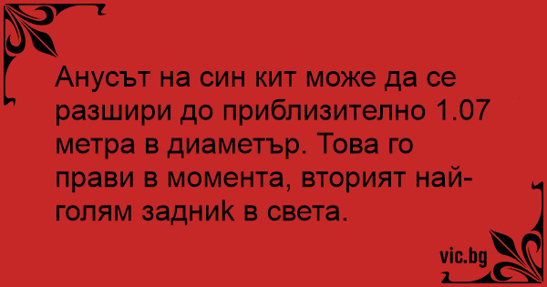 Анусът на син кит може да се разшири до приблизително 1.07 метра в диаметър. Това го прави в момента, вторият най-голям зaдниk в света.