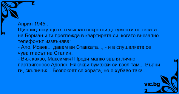 - Виж какво, Максимич! Преди малко звъня лично партайгеносе Адолф. Някакви бумажки си взел там... Върни ги, скъпичък... Безпокоят се хората, не е хубаво така...