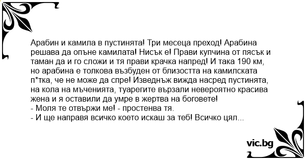 Арабин и камила в пустинята! Три месеца преход! Арабина решава да опъне камилата! Нисък е! Прави купчина от пясък и таман да и го сложи и тя прави крачка напред! И така 190 км, но арабина е толкова възбуден от близостта на камилската пуtka, че не може да спре! Изведнъж вижда насред пустинята, на кола на мъченията, туарегите вързали невероятно красива жена и я оставили да умре в жертва на боговете!