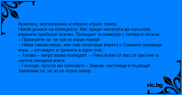 – Господи, прости ми греховете – бивши, настоящи и бъдещи! Заклевам се, че аз не играя покер. – започва арменецът.