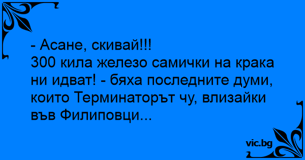 300 кила железо самички на крака ни идват! - бяха последните думи, които Терминаторът чу, влизайки във Филиповци...