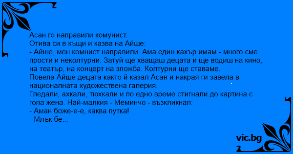 - Айше, мен комнист направили. Ама един кахър имам - много сме прости и неколтурни. Затуй ще хващаш децата и ще водиш на кино, на театър, на концерт на зложба. Колтурни ще ставаме.