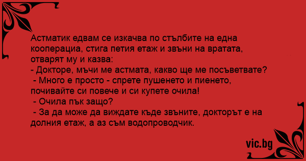 Астматик едвам се изкачва по стълбите на една кооперациа, стига петия етаж и звъни на вратата, отварят му и казва: