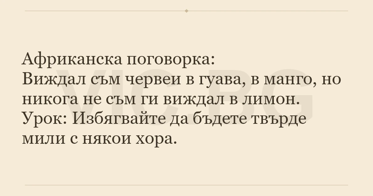 Африканска поговорка: Виждал съм червеи в гуава, в манго, но никога не съм ги виждал в лимон. Урок: Избягвайте да бъдете твърде мили с някои хора.