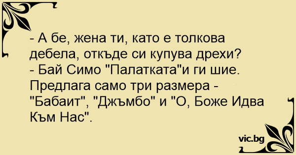 - А бе, жена ти, като е толкова дебела, откъде си купува дрехи?