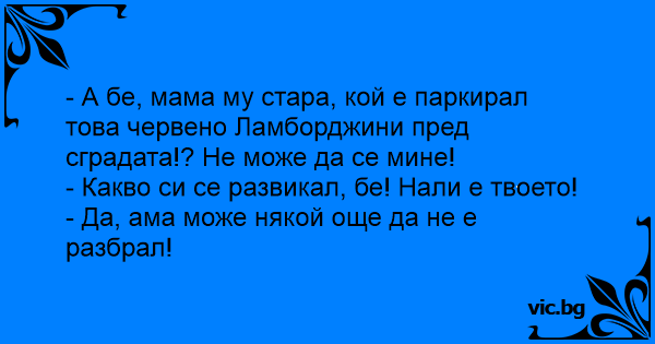 - А бе, мама му стара, кой е паркирал това червено Ламборджини пред сградата!? Не може да се мине!