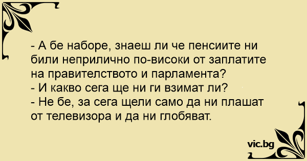 - А бе наборе, знаеш ли че пенсиите ни били неприлично по-високи от заплатите на правителството и парламента?