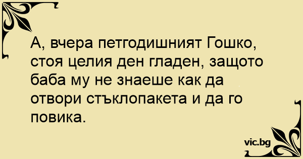 А, вчера петгодишният Гошко, стоя целия ден гладен, защото баба му не знаеше как да отвори стъклопакета и да го повика.