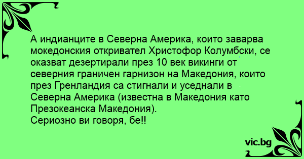 А индианците в Северна Америка, които заварва мокедонския откривател Христофор Колумбски, се оказват дезертирали през 10 век викинги от северния граничен гарнизон на Македония, които през Гренландия са стигнали и уседнали в Северна Америка (известна в Македония като Презокеанска Македония).