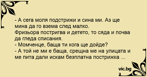 Chez le coiffeur, un homme se fait couper les cheveux puis, le coiffeur ayant terminé, il désigne du doigt un enfant et dit: Ein Mann kommt zusammen mit einem kleinen Jungen zum Friseur. Er lässt sich die Haare schneiden und sagt: К парикмахеру заходит мужчина с ребёнком. O cara chegou ao barbeiro, trazendo um garotinho pela mão: - Dá um trato na juba aí, ô do avental! - pediu ao barbeiro. O barbeiro cortou seu cabelo e, em seguida o homem disse: - Agora, vai... Mężczyzna z chłopcem wchodzą razem do fryzjera. Po tym, gdy facet został już ogolony, ostrzyżony i jeszcze kazał zrobić sobie manicure, posadził na fotelu chłopca i mówi do niego: - Poczekaj tutaj,... Im Friseursalon Ein Mann und ein kleiner Junge betreten den Friseursalon. Der Mann verlangt das volle Programm: Waschen, schneiden, föhnen, Nagelpflege. Als er fertig ist, setzt er den Jungen in... Een man en een kleine jongen kwamen samen een kapperszaak binnen. Nadat de man de volledige behandeling had ondergaan -scheren, wassen, manicuren, knippen enz.- zette hij de jongen in de stoel. “Ik... Egy férfi egy kislánnyal kézen fogva betér a fodrászatba. Miután a felnőttnek kész a borotválás, hajvágás a kisgyereket ültetik be a székbe, a felnőtt pedig odaszól a gyereknek: - Amíg elkészülsz,... Egy pasi és egy kisfiú bemennek a fodrászüzletbe. Miután a felnőtt túl van egy manikűrön, borotváláson, hajmosáson és hajvágáson, azt mondta a gyereknek: - Na, kisfiam, most te jössz. Amíg... До перукаря заходить чоловік з дитиною. — Постригти? Поголити? - Запитує перукар. — І те, і інше, - відповідає чоловік. Після того, як майстер закінчує, чоловік каже: — А тепер пострижіть малюка, а... Een man komt bij de kapper met een kind. Zegt de man kan ik mijn haar knippen? dat is goed zegt de kapper als de man zijn haar had geknipt,zegt hij knip ook even de haar van de jongen,ik moet even...