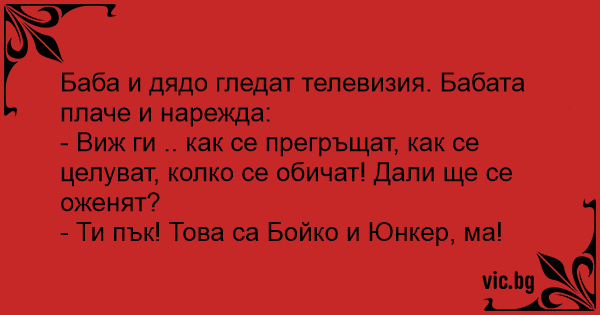 Баба и дядо гледат телевизия. Бабата плаче и нарежда: