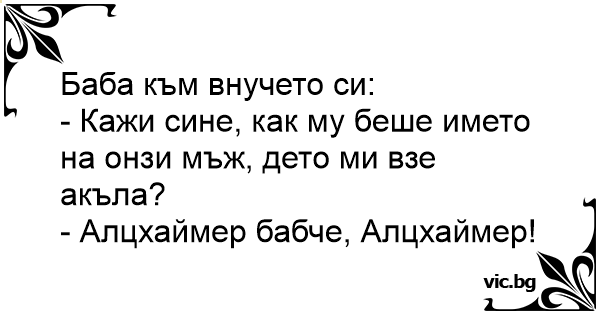 A third old woman, full of happiness, asks her granddaughter; "My sweety, remind me please.. What’s the name of that German guy that blew my mind off...?" "Alzheimer, granny!"